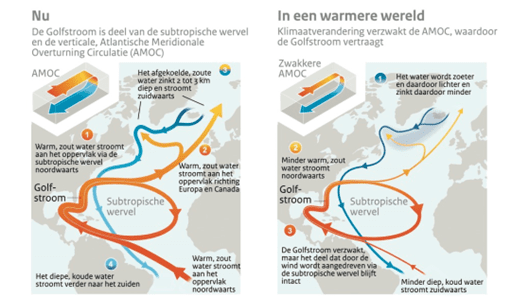 Recent publiceerden Nederlandse wetenschappers nieuwe inzichten over het risico dat de Atlantische oceaanstroming stilvalt. Deze 'transportband' in de oceaan, AMOC (Atlantische Meridionale Overturning Circulatie) genoemd, transporteert warm water vanuit het zuiden naar het noorden van de Atlantische oceaan. Valt deze stil, dan stokt de warmtetoevoer naar het noorden van de oceaan. Voor Noordwest-Europa kan dit drogere zomers en zeer koude winterextremen betekenen. Het onomkeerbare begin hiervan zou al vóór 2100 kunnen plaatsvinden. Dat is veel sneller dan tot nu toe werd gedacht.